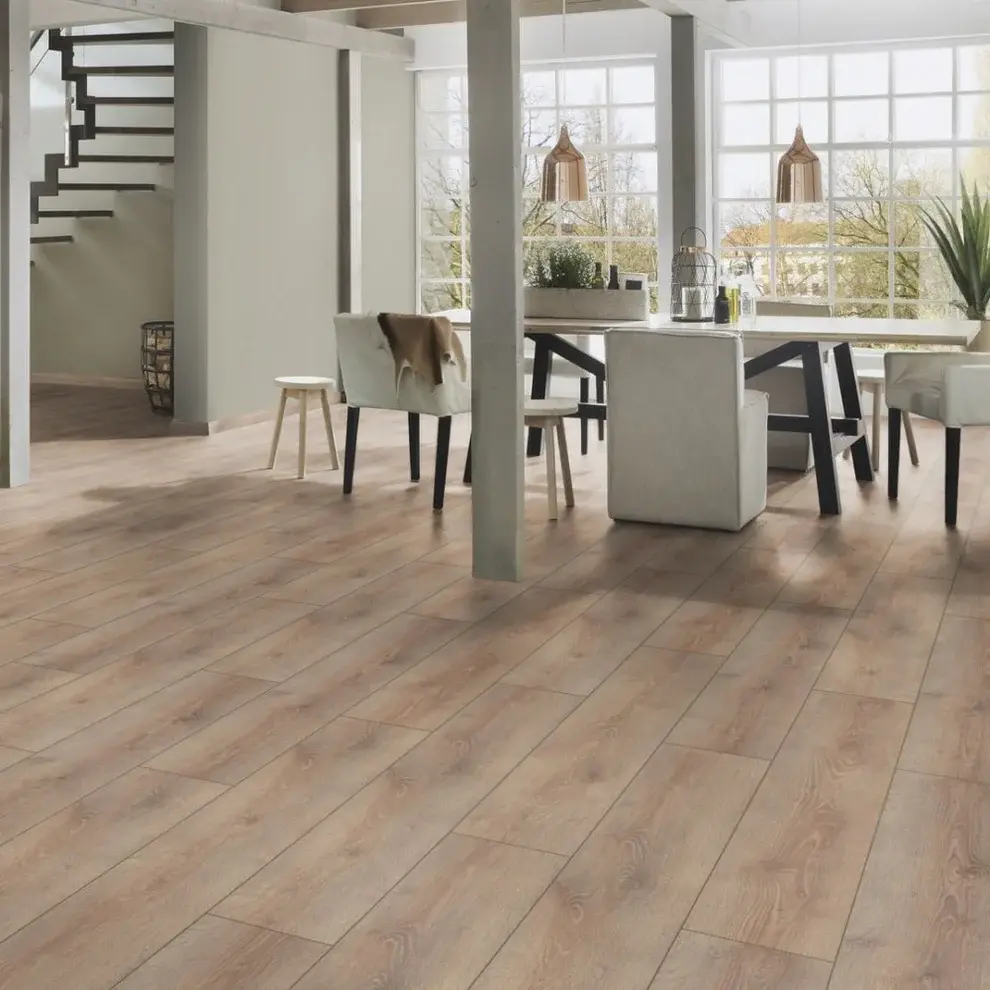 The Clearwater Oak 8mm Laminate from Krono Original’s Supernatural Classic range offers timeless oak style with bevelled edges, AC4 durability, and 24-hour water resistance. Backed by a lifetime guarantee, it’s a practical and elegant flooring choice.