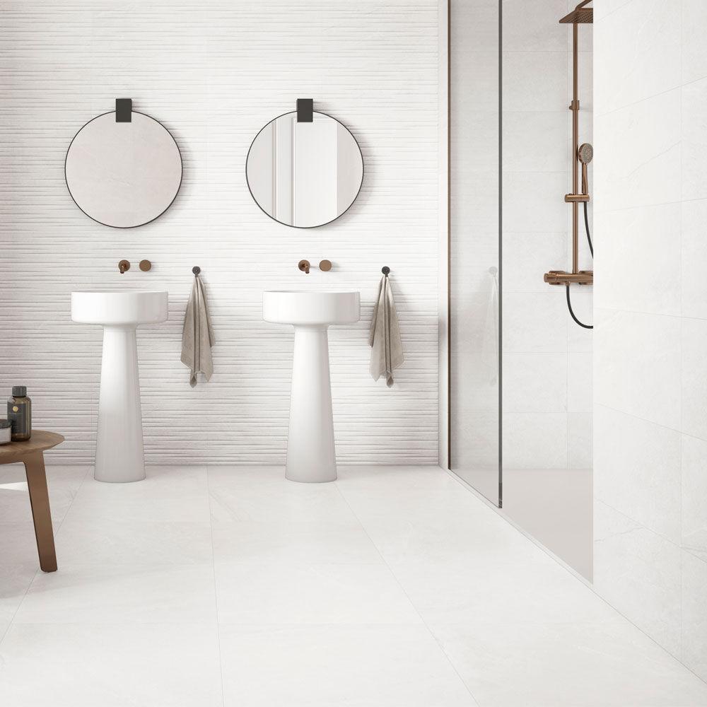 Large-format white glazed porcelain tile with a soft stone-effect matt finish, suitable for both walls and floors in kitchens, bathrooms, and living areas.