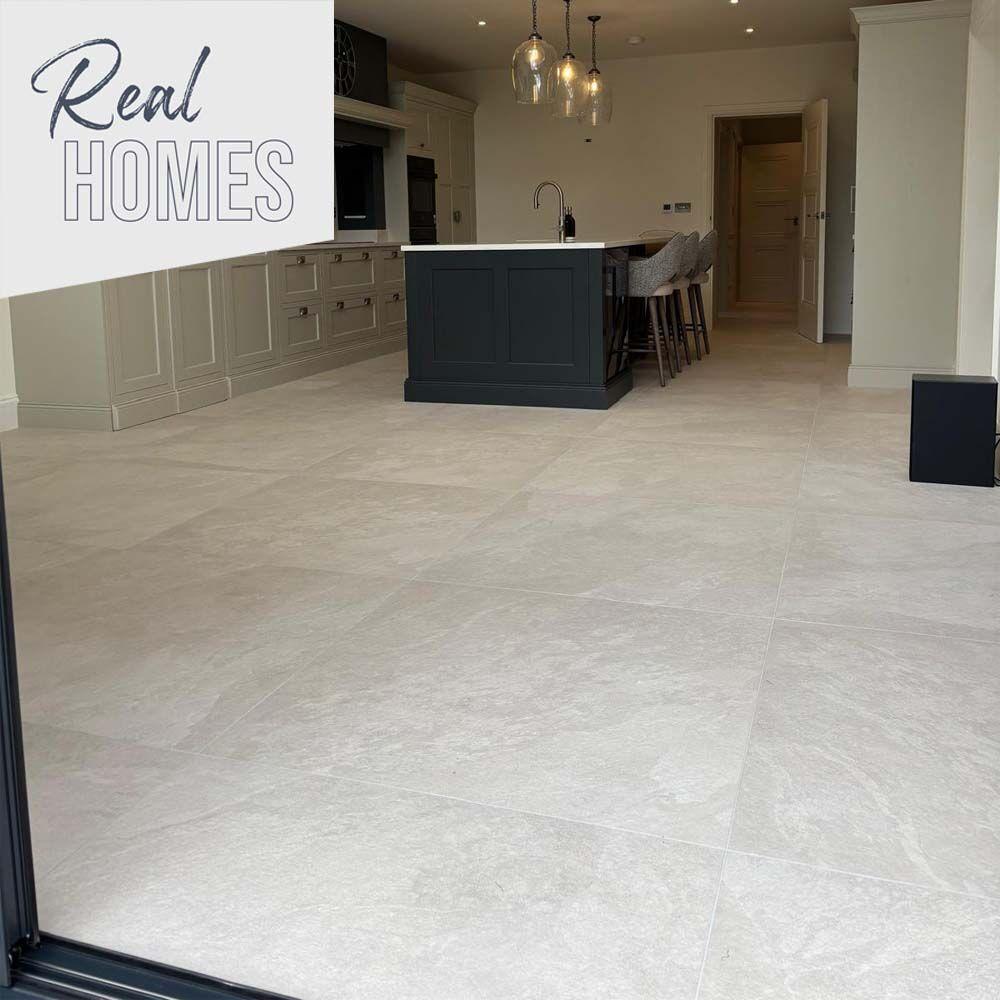 Large-format white porcelain tile with a matt stone-effect finish, perfect for open-plan living, kitchens, and modern bathrooms.