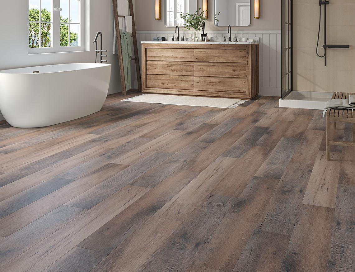 Dark oak-effect SPC vinyl flooring in a 1220x180mm straight plank design with 6.5mm rigid core and 25-year warranty. Waterproof, durable, and easy to install—perfect for kitchens, bathrooms, and busy family spaces.