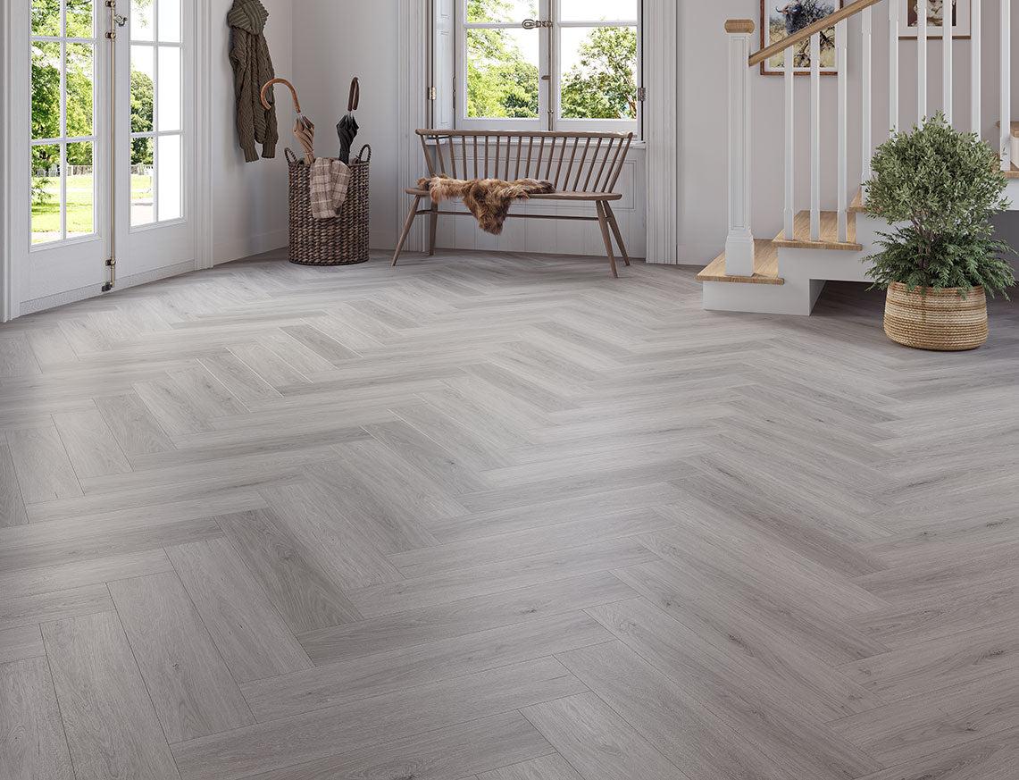 Contemporary grey oak-effect herringbone SPC vinyl flooring in 615x128mm planks with 6.5mm rigid core and 25-year warranty. Waterproof, durable, and easy to install—ideal for kitchens, bathrooms, and modern interiors.