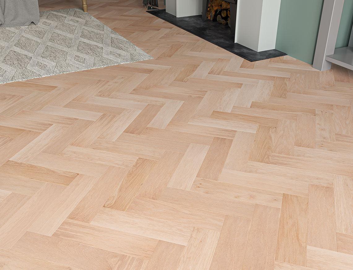 EURO New Engineered Herringbone Oak – 80mm x 300mm light oak blocks with a smooth unfinished surface. Perfect for custom finishes and timeless herringbone style.