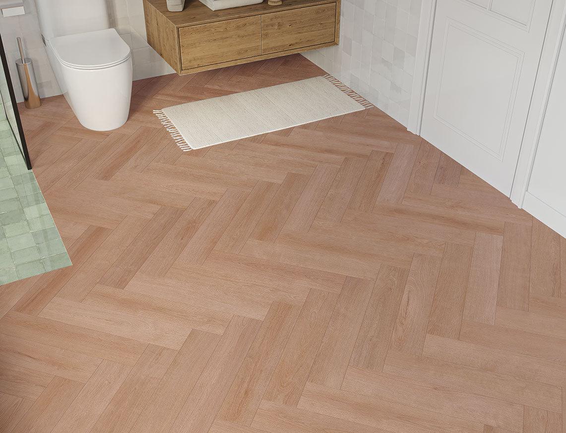 Light brushed oak herringbone SPC vinyl flooring, 8mm thick with Valinge 5Gi click system. Waterproof, durable, and stylish—ideal for kitchens, bathrooms, and modern interiors.