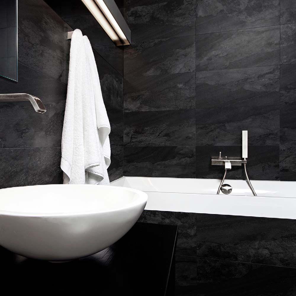 Striking black glazed porcelain tile with a matt finish and natural stone-effect design, perfect for bold modern walls and floors.