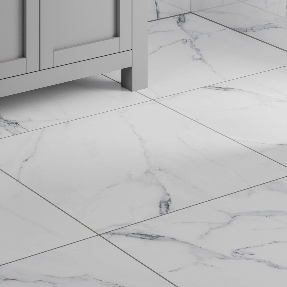 With its large 600x600mm format, this tile reduces grout lines, helping to create a seamless, expansive feel in open-plan kitchens, bathrooms, and living areas. The soft matt finish enhances the natural marble effect, giving a calm and understated look while reducing surface glare.