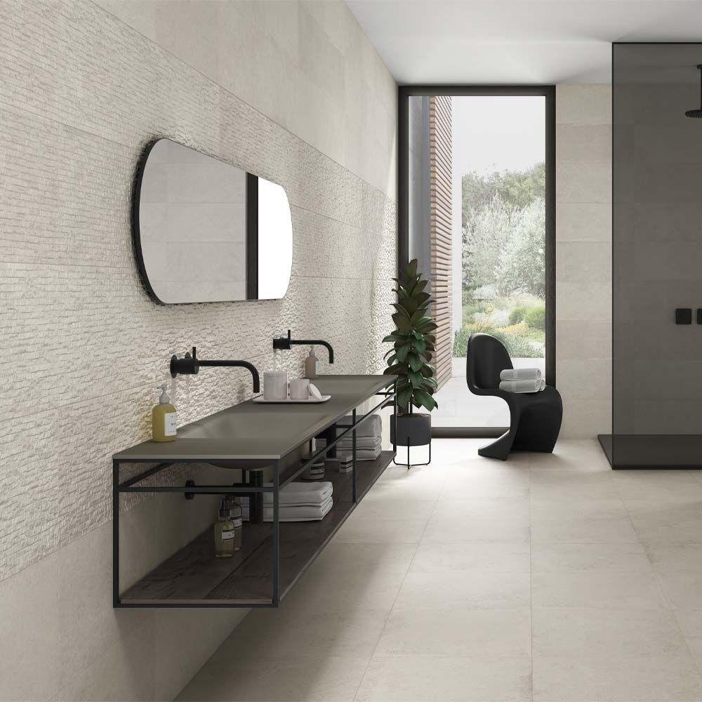 Large-format cream glazed porcelain tile with a natural stone-effect matt finish, suitable for both walls and floors in contemporary interiors.