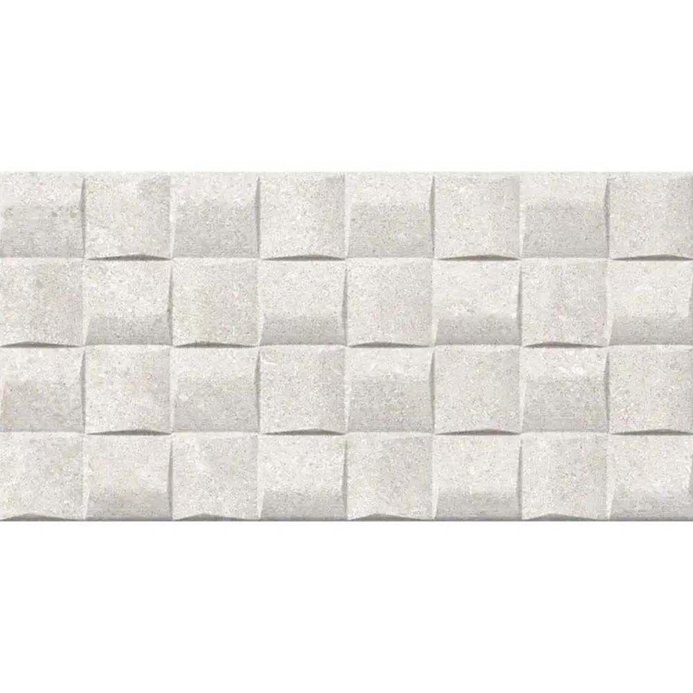 Cream ceramic wall tile with a structured 3D cube design and matt finish, perfect for textured feature walls in kitchens and bathrooms.