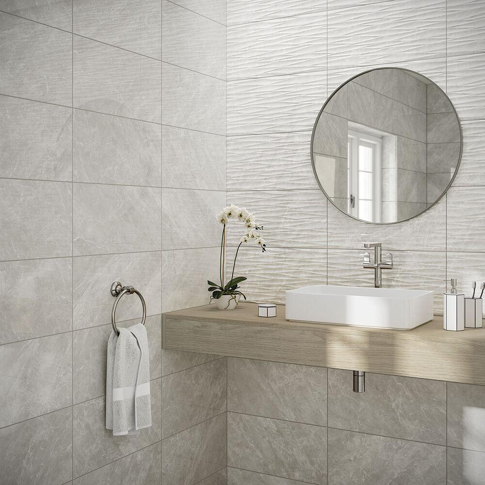 Stylish grey wall tile with a glossy finish and subtle structured pattern, ideal for modern bathrooms and kitchens.